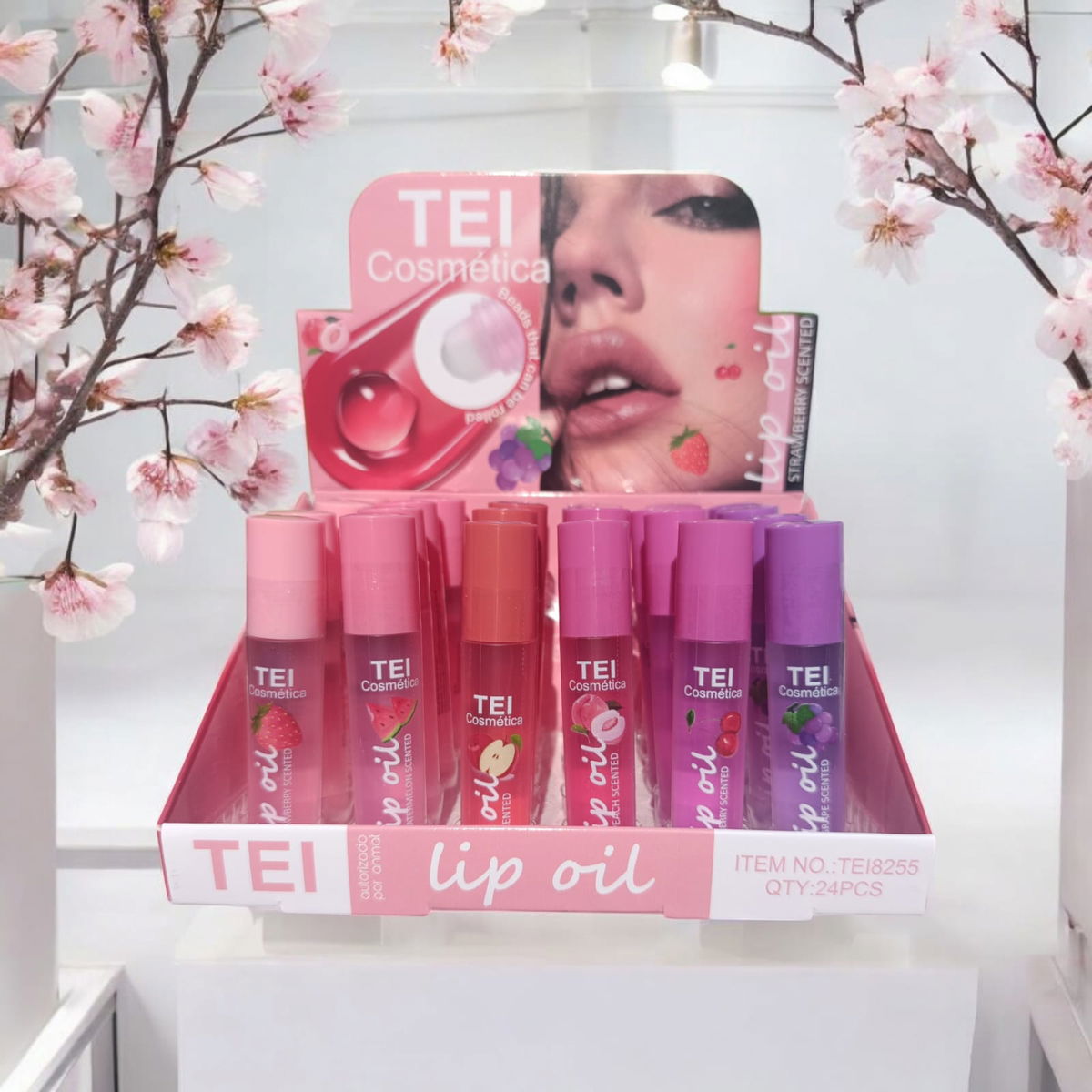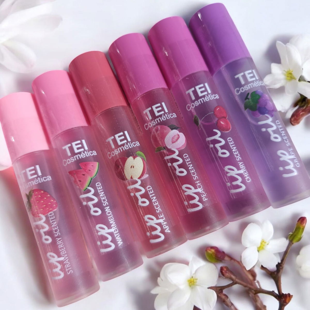 🌸 Lip Oil Frutales Tei Cosmética Aceite labial hidratante con deliciosas fragancias frutales 🍓🍉🍏🍑🍒🍇. Nutre, suaviza y da un brillo ligero sin sensación pegajosa. Ideal para labios secos o para usar antes del labial.