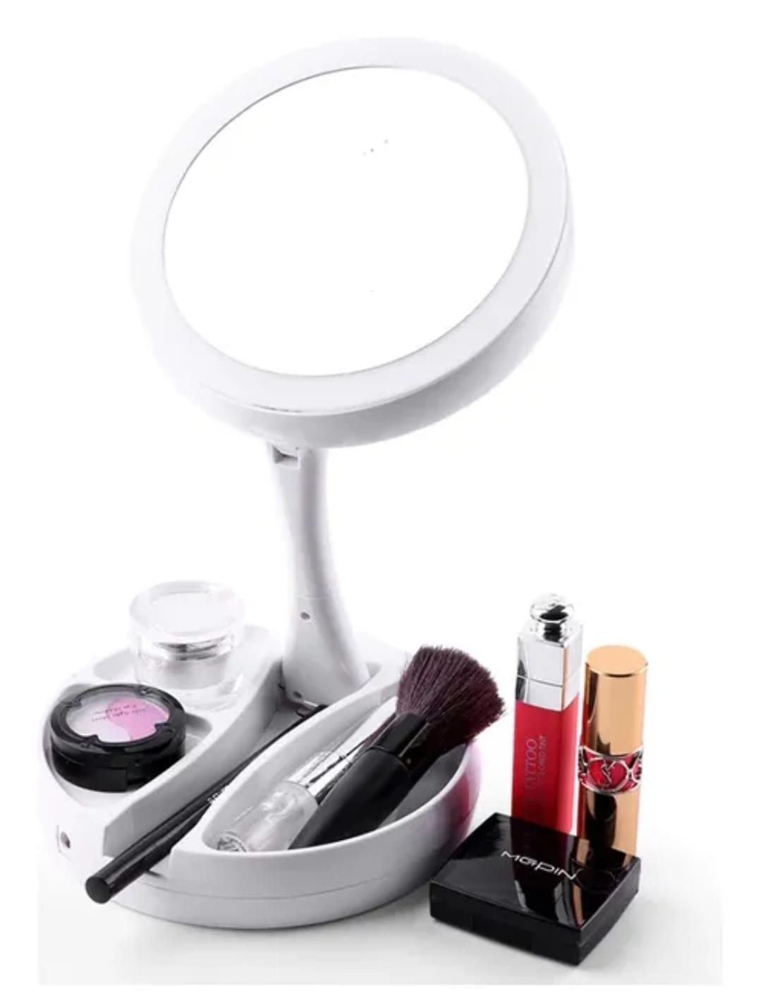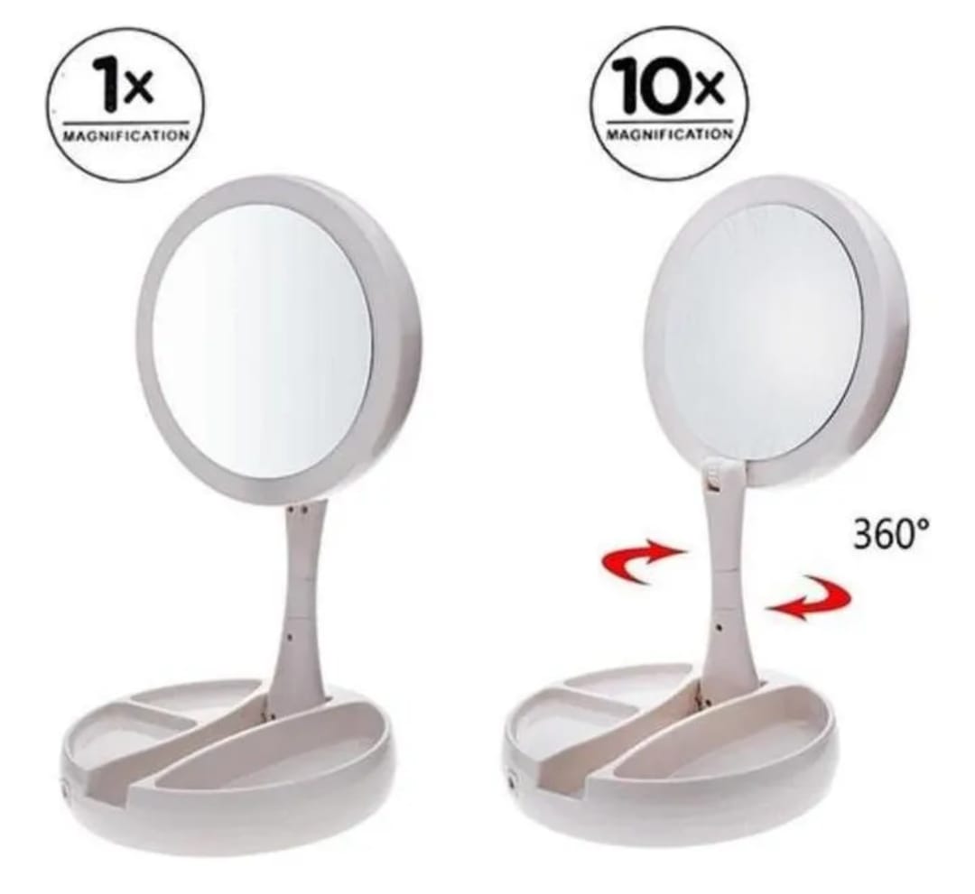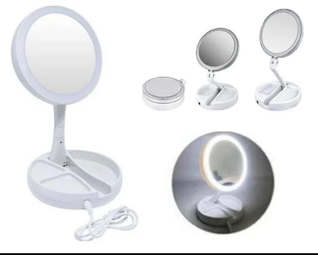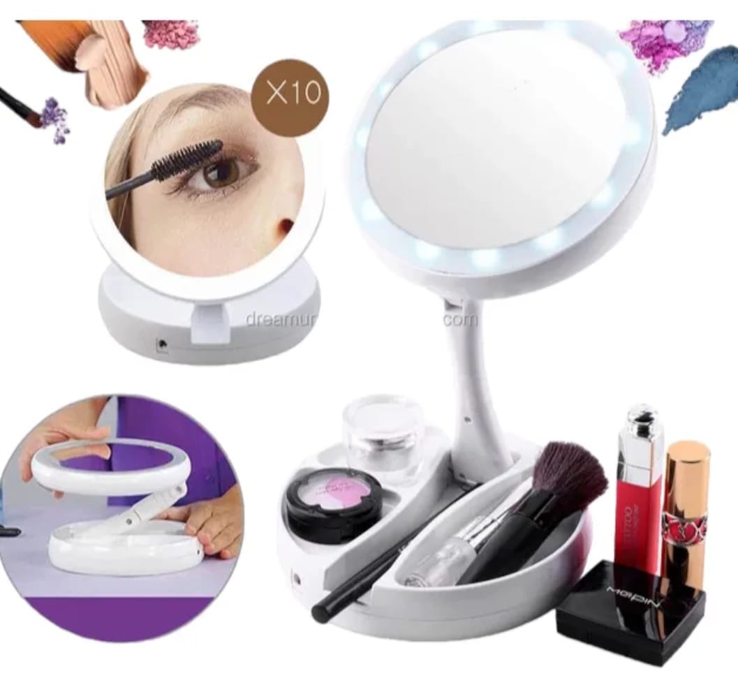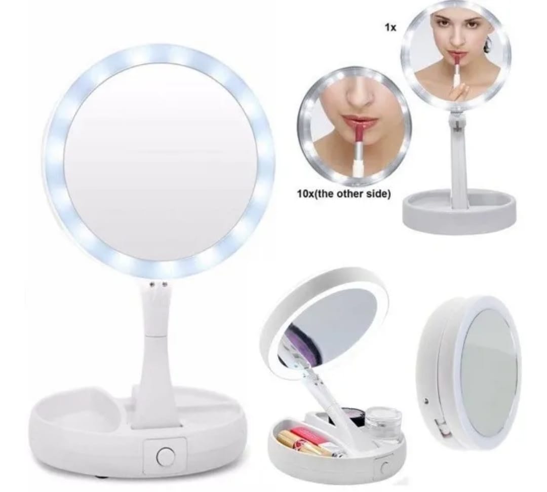 El aliado ideal para tu rutina de belleza 💖. Este espejo plegable cuenta con luz LED integrada, base organizadora y doble cara: